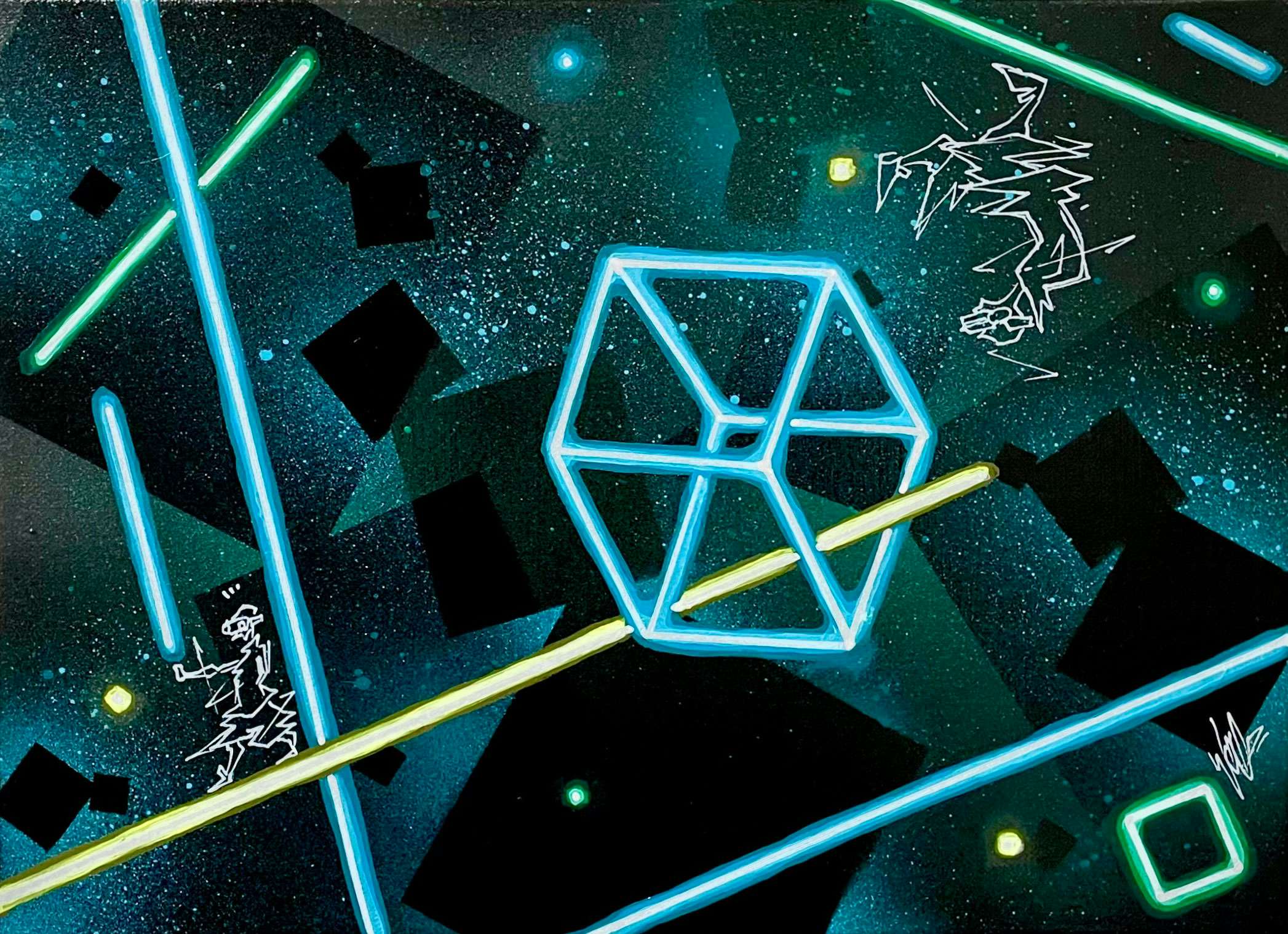 例えば、誕生の瞬間を鋭利なナイフで切り取ったかのような金属的質感の立体作品では、随所に散りばめられたグリーンによって対比された躍動的な時間軸が魅力。現実のモノを非現実的にモチーフ化するといったスタイルも、ひとつのマンガ的解釈だ。いっぽう、メディウムの差異が織り成す層が魅力のキャンバス作品は、アニメ制作におけるレイヤーを想起させ、デジタルな風合いをあわせ持つ。
