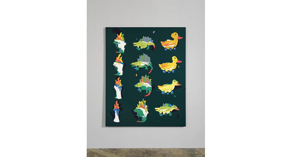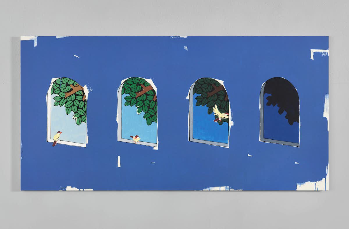 今作に描かれているのは、オオクボのパーソナルな出来事、遠くで起こっている社会現象、家族の風景、お気に入りのモチーフなど多様だ。一見関連のなさそうなそれぞれの風景は、均等な距離を保ちながらも溶け合うようにして接続され、1枚のキャンバスの上に同居している。