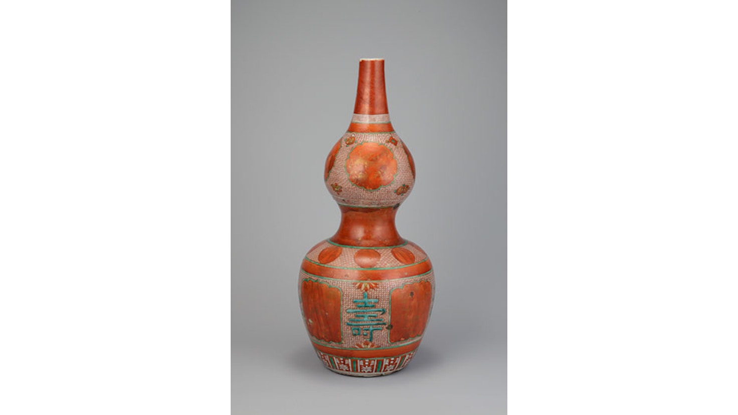 重要美術品《五彩寿字花鳥文瓢形瓶 金襴手(ごさいじゅじかちょうもんひょうけいへい きんらんで)》は、中国では祝いのモチーフとして用いられる瓢箪(ひょうたん)をかたどった大型の瓶。下部に翠青色の大きな「壽」字を配し、左右の窓のなかには、赤地に金彩で鹿(鹿は中国語で「禄」と音が通じる吉祥文)などが描かれている。