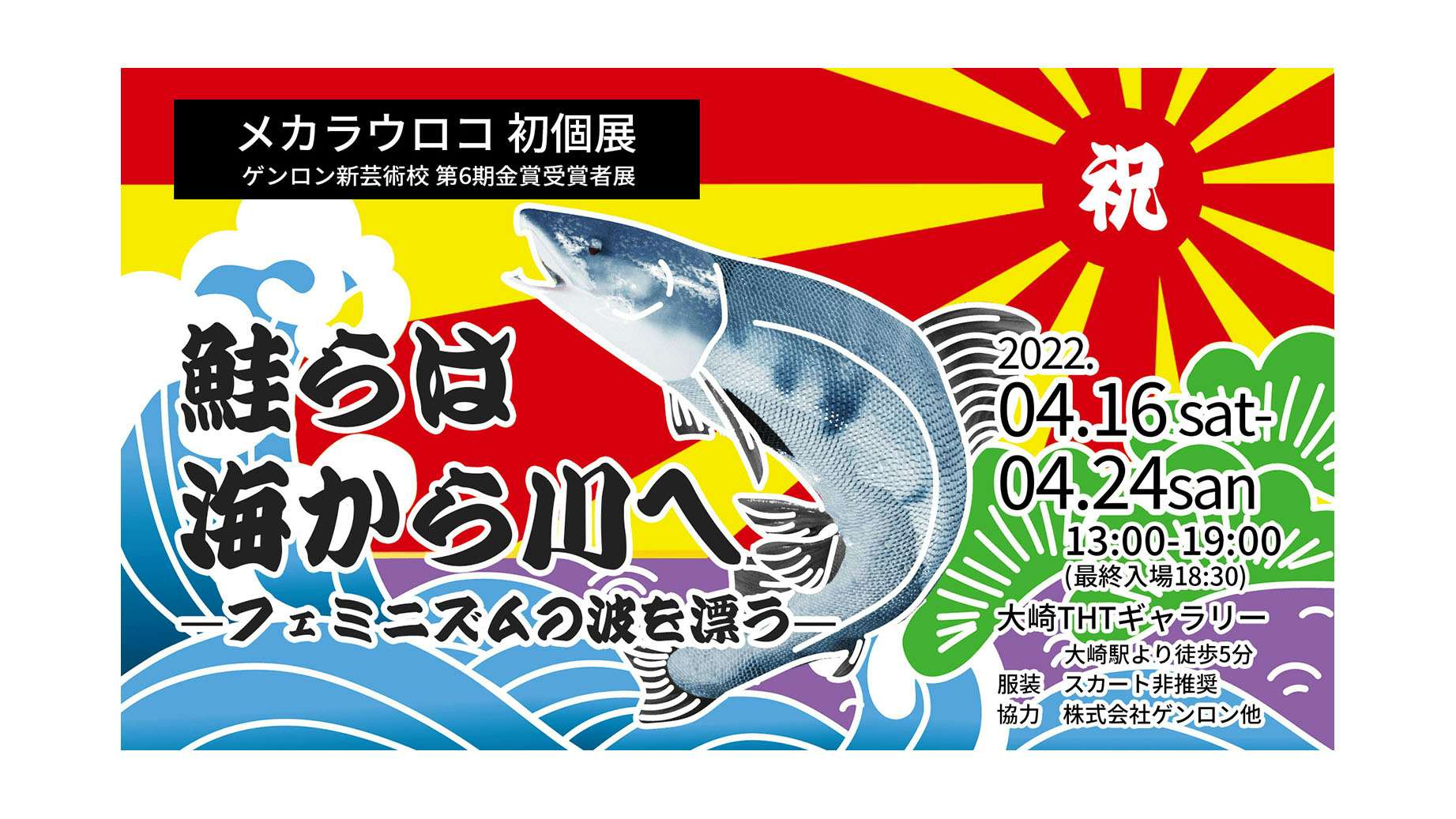 株式会社ゲンロン主催のアートスクール「ゲンロン新芸術校」の第6期金賞受賞者、メカラウロコによる個展「鮭らは海から川へ―フェミニズムの波を漂う―」が大崎THTギャラリーで開催される。4月16日から4月24日まで。