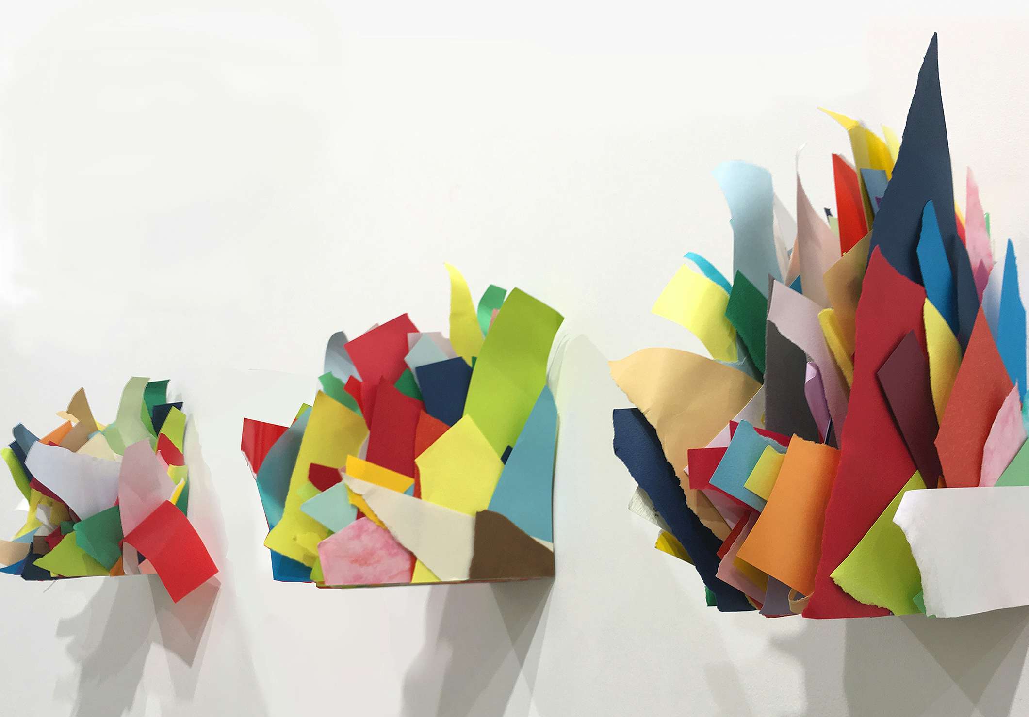 品川はるなは、何色もの絵の具を積層し鉱物のように固形化させて加工した作品などを制作。色彩を単なる色としてではなく物質として扱うことによって、絵画に隷属する一要素から自律するマテリアルへと変容させようとしている。