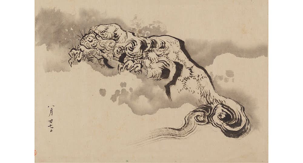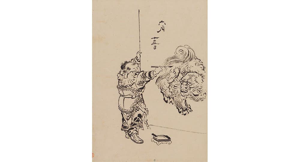 重要文化財にも指定される《日新除魔図》は北斎が晩年に手がけた作品。「日新たに魔を除く」ことを願い、ほぼ毎朝、獅子や獅子にゆかりのある人物などを日課として描いた。北斎が83歳から84歳で制作した作品は、その後、信州松代藩士・宮本慎助に贈られたとされている。