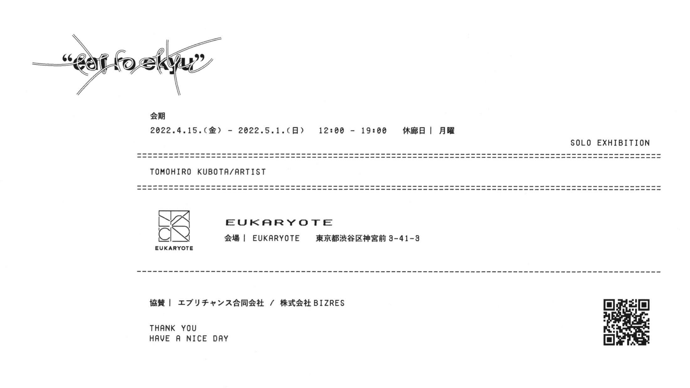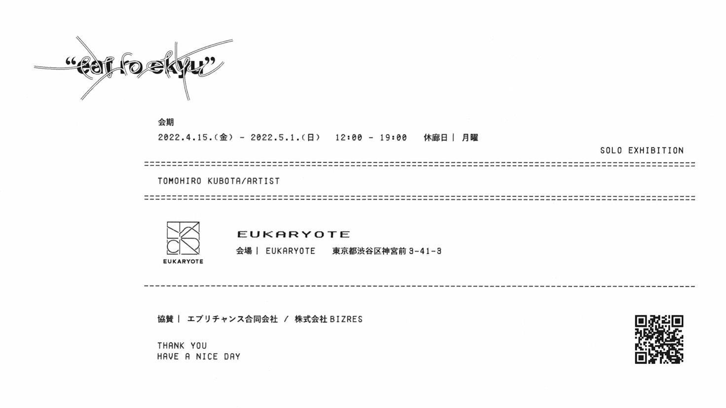 EUKARYOTEでは、若手アーティスト・久保田智広の初個展「eat ro ekyu」を開催する。本展キュレーションは岩田智哉。