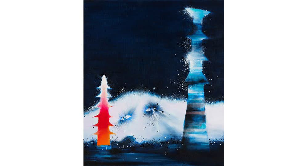 今回の新作は濃紺の背景が目を引く。ここ数年の難しい時間のなかでも変わることなく、山や植物の美しさ、日々の生活を愛でて、これからも作家として描き続ける意思が感じられる、そんな作品だ。