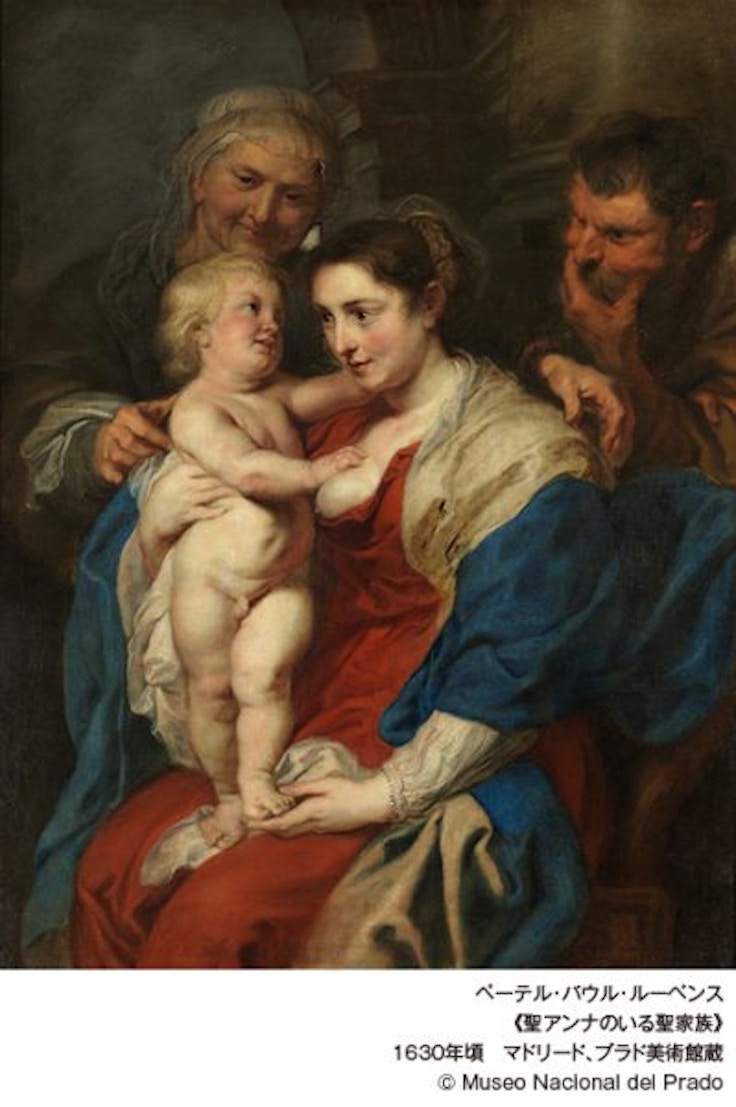 そして、彼がマドリードで親交を結んだ唯一の相手こそ、ベラスケスだった。ルーベンスの作品《聖アンナのいる聖家族》を見ると、先ほど紹介したベラスケスの作品とはまさに対照的と言って良い。中心に聖母子、そして2人を後ろから抱擁するマリアの母聖アンナ、そして右端には聖ヨシフが等身大にクローズアップされて描かれている。指で押せばはじき返してきそうなバラ色の頬や黒い目からは匂い立つような生気が、個々の仕草や表情からは家族らしい暖かな情愛が感じられる。何より印象的なのは、画面いっぱいにあふれる青や赤などの色彩の豊麗さである。これは、ルーベンスがとりわけ強い関心を寄せていたティツィアーノの影響による。