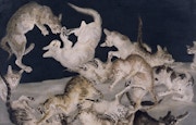 これまで紹介した作品をはじめ、藤田の作品の多くに登場する猫が、ここでは本能をむき出しにして争っている。一匹一匹が見せる多様な表情や姿態、ヒゲや毛先まで細かく描かれた柔らかそうな毛並みも印象的である。