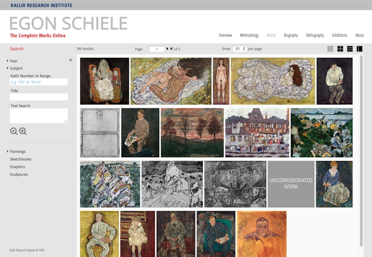 同サイトは、シーレのもっとも新しいカタログレゾネであるジェーン・カリアによる『Egon Schiele: The Complete Works』 (1990に刊行、98年に改訂)をもとにしたものであり、現時点でペインティング、素描、彫刻などを掲載。なかでもペインティング の掲載数は419点にもおよび、シーレの代表作として知られる《ほおずきの実のある自画像》(1912)、《死と乙女》(1915)なども見ることができる。