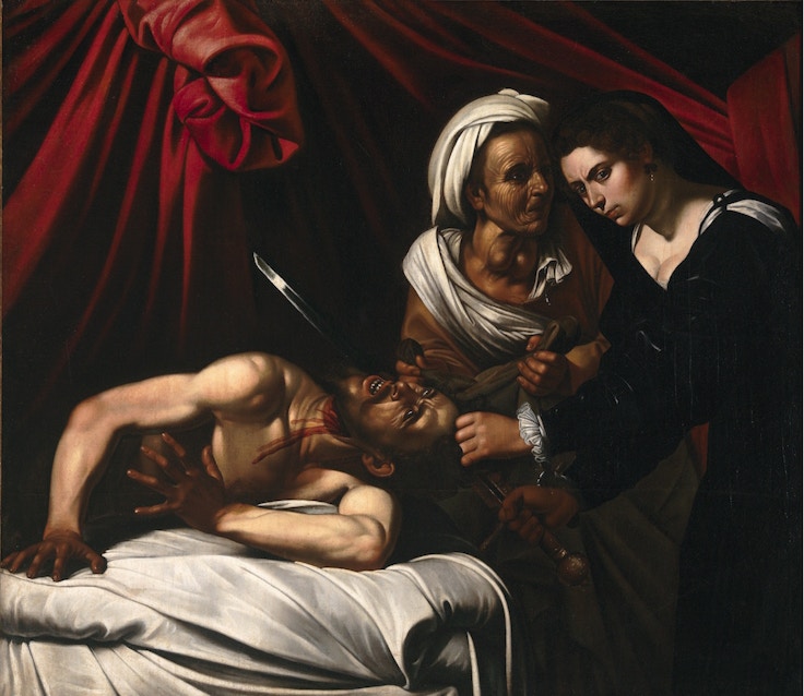 《ユディトとホロフェルネス》のテーマとなっているのは、旧約聖書のユディト記の一節。ベトリアという町に住んでいた若い未亡人ユディトは、町を侵略・包囲していたアッシリア軍に対抗するため、将軍ホロフェルネスを誘惑し、殺害することを企てる。本作は、ユディトがホロフェルネスのテントに赴き、侍女アブラの目の前で彼の首を切りつける瞬間を描いている。