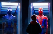 タイトルの「スパイダーバース」とは、文字どおり「スパイダーマンたちの宇宙」を意味する。舞台は粒子加速器による実験の影響で時空が歪み、異なる次元のスパイダーマンたちが集まってくるようになってしまったニューヨーク。そこで新たにスパイダーマンとしての能力に目覚めた黒人の少年マイルス・モラレスが、別次元からやってきた頼りない中年のピーター・B・パーカーや、スマートな同級生ステイシー・グウェンなど、様々なスパイダー人間たちに助けられながら、悪の親玉キングピンの野望に立ち向かっていく。原作であるコミックスの時点で、ファンたちに親しまれてきた従来の主人公ピーター・パーカーを死なせ、このアフロヒスパニック系の新主人公マイルスを導入したことは「政治的正しさ」へのおもねりなのではないかという批判があったようだが、本映画版はジュヴナイル作品としての基本である成長物語のプロットに、マイノリティの社会的承認と自己アイデンティティの確立を促すようなメッセージを意図的に組み込んだものとなっており、「スパイダーマン」シリーズがもともとクラスのオタクっぽい少年つまり弱者が特殊能力を手に入れて人々の「親愛なる隣人」になっていくという話だったことを思い出すならば、むしろきわめて正当かつ必然的なキャスティングがなされていると言わねばならない。