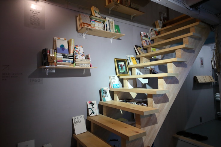 本がたくさん並ぶ階段を上がると、常設展に混じり陶芸家の西條茜さん、画家の岡本秀さんの1000円から購入できる小作品が展示販売されている。