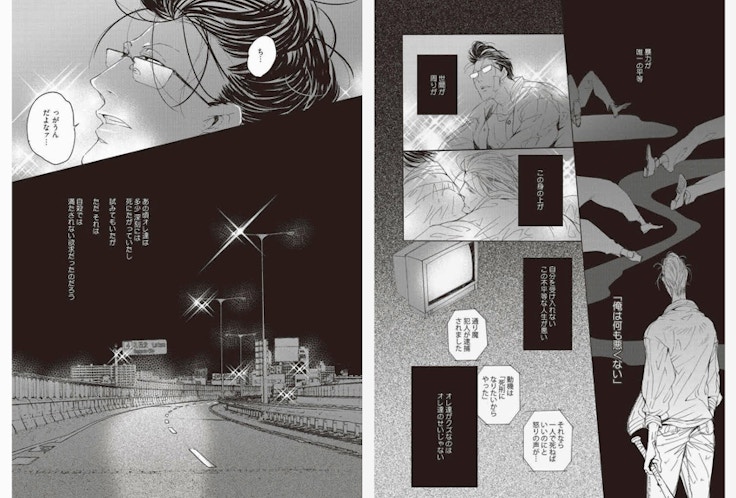 印象的な場面がある。札幌に出てくる前の不良少年だった八敷と佐伯が描かれるくだりで、ブラウン管のTVから通り魔の犯人が逮捕されたことを伝えるニュースが流れてくる、本筋とはほぼ関係のない小さなコマだ。「動機は『死刑になりたいからやった』」「それなら一人で死ねばいいのにと怒りの声が…」とニュースが伝えている。知っている、と思う。現実にもそういう事件はたびたび起こって、そのたび犯人への憤りが「ひとりで死ね」という合唱になるのを、私たちはもう見知っている。けれども、次のコマで佐伯は、とても静かに「ち…っがうんだよなァ…」と中空に向かって呟くのだ。それは、クズであることをすべて人生の不遇と世間のせいにするのも違うし、死にたい気持ちがあったとしても死ねば救われるわけではないし……というやるせない響きとして届く。ちがうんだよなァ…の先の答えはない。