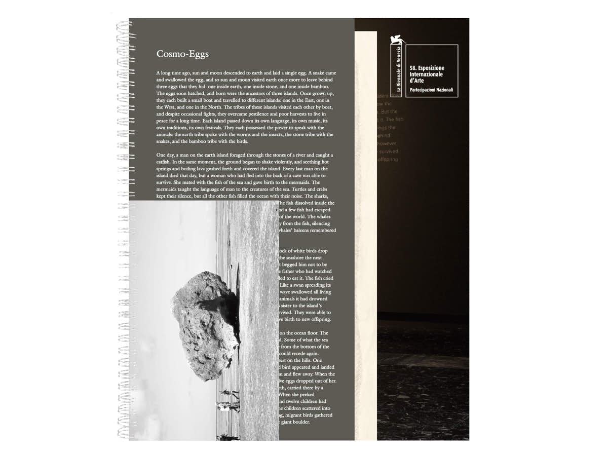 第58回ヴェネチア・ビエンナーレの日本館展示にあわせて刊行されたコンセプトブック。地球環境が重大な変動期を迎えている現状を惑星的スケールからとらえ直すべく、4人の表現者が人間/非人間が共存するエコロジーをめぐる「宇宙の卵」プロジェクトを展開。美術家・下道基行による「津波石」のフィールドワーク、音楽家・安野太郎による楽曲のスコア、芸術人類学を専門とする石倉敏明の神話捜索などを収録。写真、テキスト、創作ノートなど、異なる表現形態にあわせたバインダーファイル形式で非常に凝った造本。(中島)