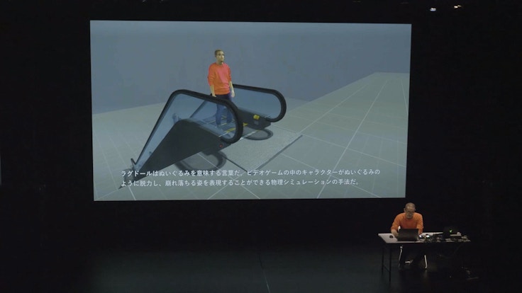 作品はこのようにして始まる。谷口は、自らをシミュレートするものとしてのアバターのように池袋を歩き、それを再現するものとしての映像と自らの身体を同期させて舞台に登場する。このとき谷口の身体は、自らをもとに制作されたアバターや記録映像を再度基準に据えて再編成される。シミュレートするものとされるものの関係は、原型とその再現という順序的な関係ではなく、その地位を絶えず反転させつづけるダイナミックな関係になっている。ここに登場するすべての「谷口」は、ある水準ではなにかの原型であり、また別の水準ではなにかのシミュレーションなのだ。そしてこの構造は、作品自体のもつ演劇という形式によって強調される。「谷口」が「谷口」を演じるという自己参照の再帰的な繰り返しだ。