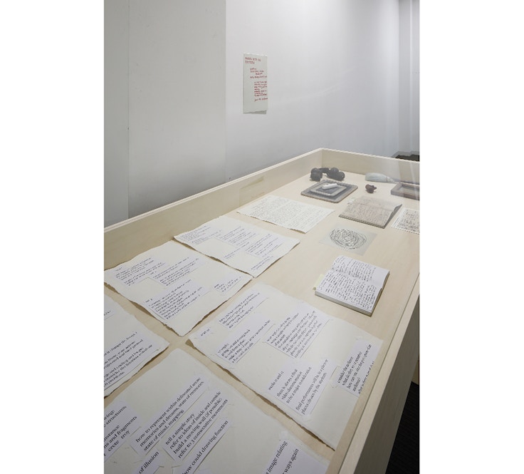 展示室にはティーチングに用いられたメモや、ドキュメンタリー映像資料などが展示され、ドイツやイタリアの学生たちや、夏の別荘のあるカナダの村で行われた子供たちとのワークショップの様子などに触れることができる。とくに、マサチューセッツ工科大学(アメリカ)でのパフォーマンスクラスの記録は詳細に紹介されていて、10週間にわたって行われたプロセスを通覧することで、いかにしてジョナス作品が組み立てられていくのかが明瞭に理解できる。参加者各人が持ち寄った詩を分析し、それを映像などの表現方法に置き換えるためのアイデアを模索したり、日記を書くことで歴史と個人的な日々の暮らしを近づけたり......。この実践的なプロセスに触れられるのは、若きアーティストたちにとって幸福な経験に違いない。