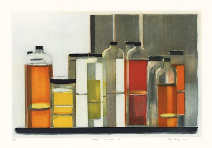 《Bottles & Jars I》(2009)はアクアチントの作品。仕上がりは一見水彩画のようだが、よく見ると均質な透明感があり、水彩画とは異なることが分かる。