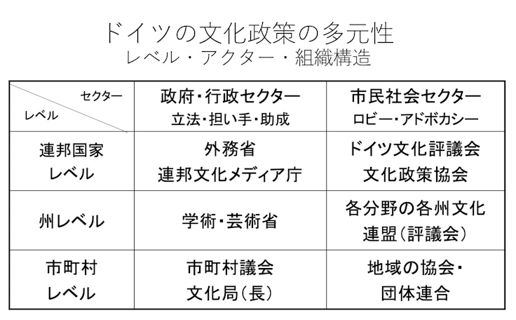 そればかりではない。これらの各公共セクターにおける文化政策自体が、その内部において分権的構造をもち、市民社会セクターからの政策提案に基づいて議論され、合意形成されてきたのである。国家主導の文化政策は一貫して避けられているが、それは民営化論を意味するものではない。ドイツの分権的構造が、日本で物議を醸してきた民営化論とは異なる文脈であることに留意したい。