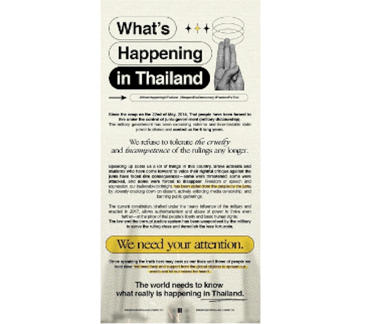 ほかにも、タイ国外でも評価の高いフィジカルシアターカンパニーのB-floorが、2010年に政府の治安部隊が市民のデモ隊を虐殺した事件を題材にした作品《FLU-FOOL》の2020年バージョンの再演を発表するなど、様々なジャンルのアーティストやパフォーマーが作品をつくり、学生たちの民主化運動を支援している。