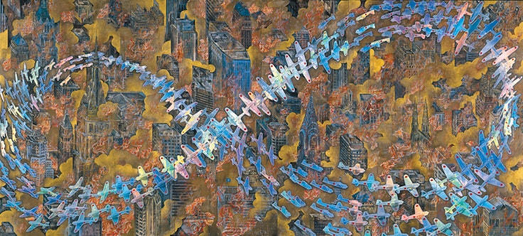 ただ今回については、個人的な腹案があった。その時僕は、会田誠の《紐育空爆之図〈にゅうようくくうばくのず〉(戦争画RETURNS)》を表紙に使わせてもらうことはできないだろうか、と考えていたのだ。《紐育空爆之図》は、マンハッタンのビル街の上に、キラキラと光るホログラムペーパーのゼロ戦の編隊が「無限大」のマークを描いている、1996年の作品だ。
