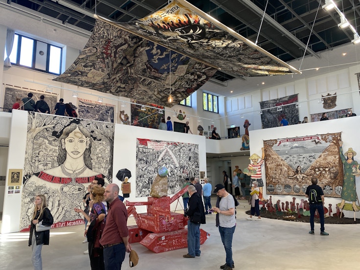今回は新型コロナウイルスの水際対策に際する日本への入国制限の影響など、様々な事情で展示を見に行けなかった人も少なくなかったと思う。筆者はインドネシア美術やアジアの木版画運動の専門家ではないが、運よく見に行くことができた者という立場で、これらの図録・書籍を参照しつつドクメンタ15での展示について報告したい。