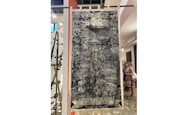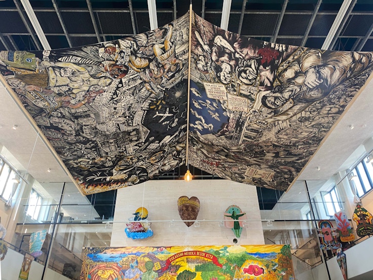 メインの展示空間は、大型のバナー作品にぐるりと取り囲まれている。さらに1点は上から吊るされ、天井画のように展示していた。こうしたバナー作品の支持体は、キャンバスなのだが、丸めたり、折りたたんだりできるようになっている。これは、拠点とするジョグジャカルタの街中にあふれる広告に着想を得ており、移動や設置が容易であることからつくられた(*11)。木版画は基本的に1色刷りであるのに対し、これらの作品は色彩にあふれ、大きなインパクトを与えていた。