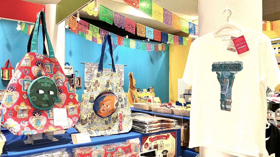 メキシコで生産されている「メルカド(スペイン語で市場の意味)バッグ」のブランド「ディミヌティーボ」の、本展でしか買えない限定カラーのバッグ。メキシコらしいビビッドカラー「Color Vino(生きている色)」と、本展で埋葬時のマスクや装飾品が展示されているマヤ文明の「赤の女王」をイメージしたエメラルドグリーンを組み合わせた、これからの季節にぴったりの涼し気なバッグに注目だ。
