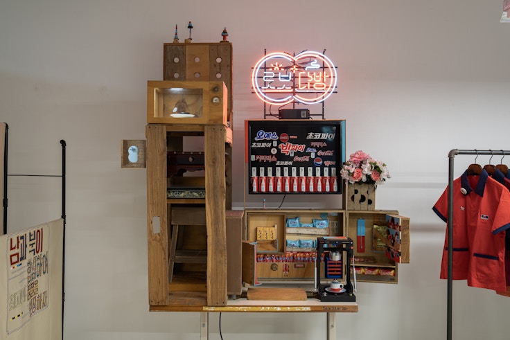 そこでは例えば、かつて2015年に日本の武蔵野美術大学と朝鮮大学の学生たちが両校舎のあいだに橋をかけ交流を図った記録も資料展示されている(李晶玉、市川明子、鄭梨愛、土屋美智子、灰原千晶)。また休戦線の南側の監視所(GP)風景や平壌を象徴するタワーの写真(ノ・スンテク)は、分断の現場がどこにでもあることに気づかせる。あるいは、2004年から南北合作で稼働していた開城工業団地が南北関係の悪化で2016年に閉鎖されたのを惜しみ、当時、北の労働者たちが好んで食べたという南のチョコパイなどを販売する可動式屋台も登場した(イ・ブロク)(*5)。