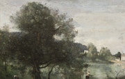 彼は、戸外の光の下で風景のスケッチを行い、冬にはそれを作品へと仕上げることを習慣としていた。《ヴィル=ダヴレーの牧歌的な場所──池畔の釣り人》は、彼の晩年の作品で、家族の別荘がある村が舞台になっている。描かれているのは、大きな池と、その前に立つ大きな樹、そして対岸に立つ家々など、ありふれた田舎の風景である。しかし、あたりに満ちる穏やかな大気と光の描写によって、平凡な風景は一篇の詩のような美しさを湛えたものとなっている。屋外でのスケッチのなかで、彼の心に刻まれた「感動」の記憶が、ここに反映されていると言えよう。