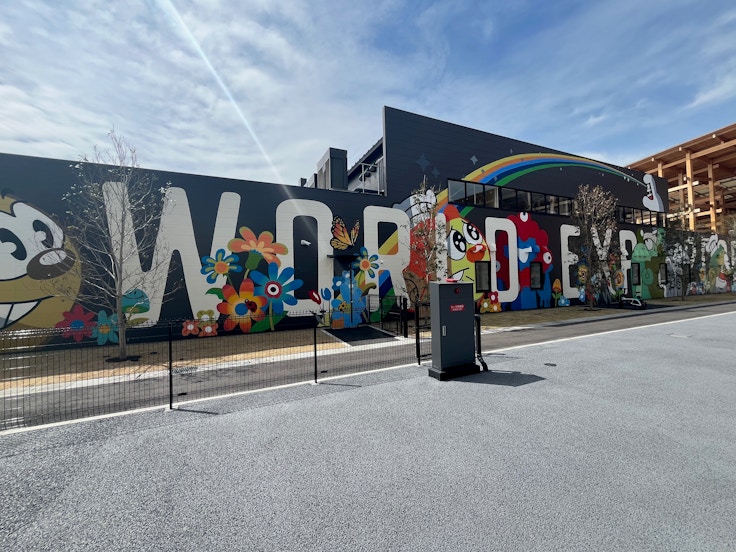 90年代よりグラフィティ・ライターとして活動をしてきたCOOKは東ゲートゾーンの休憩所の壁面に壁画《WORLD EXPO 2025》を描いた。万博をコンセプトに「世界中の人が仲良く平和に生きられるように」という願いを作品化。虹はSDGsを、たくさんの花は多彩な国々を表現したという。