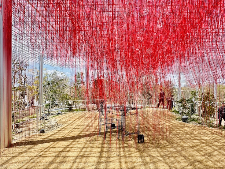 小高い丘の上にあるのが最初のシークエンス「人と人の共鳴」:塩田千春『言葉の丘』だ。天井からは赤い糸が吊り下がり、その中に万博の7つのテーマとリンクしたメッセージが配置。「echorb(エコーブ)」を持って作品の周りに立つと、位置に連動して7つの言語による7つのメッセージが表示される。