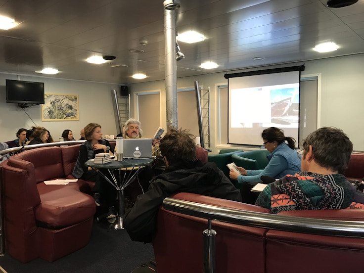 南極ビエンナーレのプログラムは、12日間の航海中に、南極半島や島々にできるだけ上陸して作品を設置し、鑑賞後に搬出して次の目的地を目指すというものだ(荒波でボートが出せないときもあり、全部で9回上陸した)。船内でも、航海中に制作されたドローイングや写真の展覧会を開催し、作家や研究者によるレクチャー、「芸術と科学」「探検」「ユートピア」などをテーマとするディスカッションが連日催されるという過密なスケジュールであり、少なからぬ参加者が船酔いや疲れで寝こんではまた復帰するというハードな航海だった。