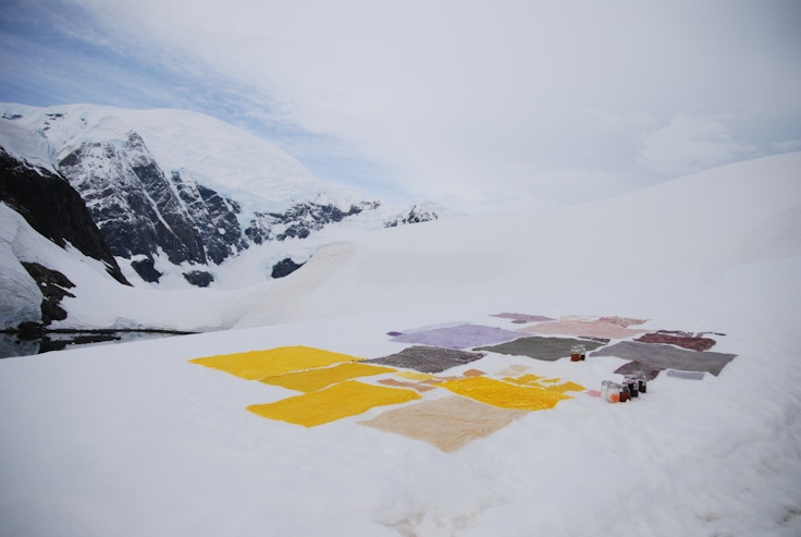 日本の両作家と並んで手仕事的な要素を持つ作品《抽象的地質学》を制作したのが、モロッコ出身のイト・バラダである。陽気なバラダは、船内の食堂で皆のテーブルを回っては、オレンジの皮や紅茶パックを集め、船底の部屋にこもって「魔女みたいでしょう」と冗談を言いながら、食材を入れた鍋で布を染めていた。そして、染め上がった色とりどりの布を、絶景で知られるパラダイス湾に面した南極半島の雪上に配置。「モンドリアンやロシア・アヴァンギャルドを思わせる」と私が言うと、バラダは「そうなの! ロシア人がたくさん乗っているから、ロシア・アヴァンギャルドを引用したの。美術史、染色の伝統、食事という人間の営みが溶けあっているのよ」と朗らかに語った。