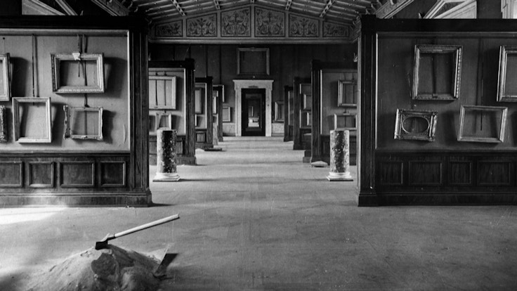 なかでも第2次世界大戦中のレニングラード包囲戦のありさまは衝撃的だ。ドイツ軍の侵攻をキャッチした美術館関係者たちは、作品の多くを事前にウラル山脈に疎開させ、美術館の地下に避難。だが900日近くに及ぶ長期の包囲により物資が絶たれ、ベルトや靴底などの革、飼い猫まで食料にせざるを得なかった。そうした状況のなか前線から戻ってきた兵士たちが美術館を訪問。そこにあるのは額のみが並ぶ空っぽの展示室だ。だが、「これはレンブラント、これは......」という解説を聞きながら、兵士たちは感嘆の溜息を漏らしたという(森村泰昌の《Hermitage 1941-2014》は、このときのエピソードに触発されて制作されたもの)。