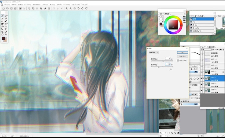 藤:はい。ほかにも「色収差」という機能で、あえて色のズレを生み出す、ということもします。使用するかどうかは好みですが、講座の最後なので説明しておきますね。同じく画面上のメニューの「フィルタ」から「色収差」を選びます。縦横方向の数値をいじると、こういう風に、色がずれるんです。