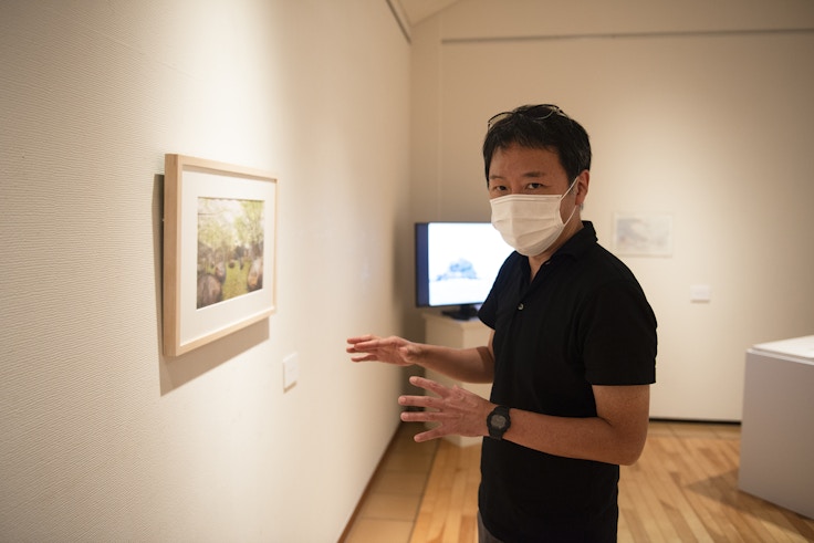つなぎ美術館では現在、1階展示室で「ユージン・スミスとアイリーン・スミスが見たMINAMATA」展が、3階展示室では「柳幸典つなぎプロジェクト2019-2021」が、屋外では「柳幸典つなぎプロジェクト成果展2021 Beyond the Epilogue」が開催されている。2021年の開館20周年を見据え、3年プロジェクトとして津奈木町の未来を考えるための作家を招聘したいという思いから、学芸員の楠本は2018年に柳幸典に声をかけた。「地域に何の忖度もすることなく、新たな提案をしてくれる作家として柳さんしかいないと思った」と強調する。