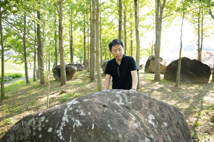 そして、「柳幸典つなぎプロジェクト」の集大成が、この秋に完成するふたつのインスタレーションだ。ひとつは、9月11日に発表された《石霊(いしだま)の森》。津奈木町ではかつて、住宅の庭に利用される石を販売していたが、戸建て住宅が減った現在、目的を失ったまま大量に保管されていた。柳は残されるべき地域の声をそうした石に閉じ込め、津奈木町役場近くに植林された銀杏の森に点在させる計画を立てた。石牟礼道子の詩の朗読、水俣病の語り部の話、津奈木町に古くから伝わる唄を収録し、石の割れ目からそうした声が微かに聞こえてくるインスタレーションが完成した。