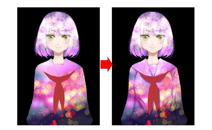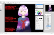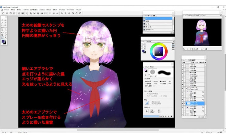 藤:制服の部分は、いまのように鉛筆ツールで円を描いていくより、エアブラシツールで服全体に宇宙のイメージを描いて、そのあとにレイヤーの「乗算」モードで服のシワや影を入れていく方法がいいかと思います。