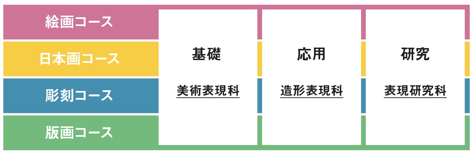 文化専門課程は入学時に4つの専門コースと、「美術表現科」「造形表現科」「表現研究科」の3つの学科から1つずつ選択する。「美術表現科」は美術を初めて学ぶ人や基礎を学び直したい人、「造形表現科」はすでに美術を学んだことのある人が対象。自らの表現をさらに探究したい場合は「表現研究科」だ。基本は月曜から木曜の週4日通学制だが、金曜と土曜に通える「美術専科」もあり、自身のライフスタイルに合わせて選択できる。