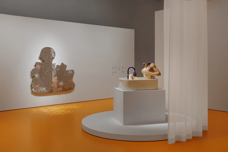 出展作品のひとつに、《Woman in Tub》(1988)がある。モチーフはポストカードのイメージで、女性の入浴中に何者かが侵入した、という場面を陶器で表現している。浴槽に見えるシュノーケルから想像される「侵入者」の視点と鑑賞者の視点がここで重なり合い、性的な欲望を掻き立てる。だが、目の前にあるのは、ポストカードのような容易に消費されるものではなく、精巧な「芸術作品」である。女性の唇、肢体は素材の転換によってそのキッチュな性質が一層強調され、鑑賞者は自らの欲望に向き合うよう促されると同時に、作品としてその感性が固定される。作家の表現は大衆文化への皮肉ではないか、という疑念を抱かせるほどに直接的だが、その姿勢は一貫している。作品は「セルフ・アクセプタンス」、すなわち人々が自らを受け入れるためのものであると。