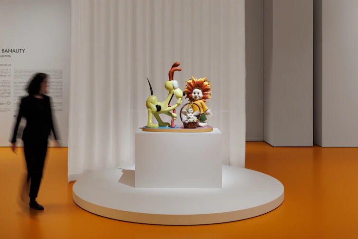 本展においてまず特筆すべきは、1988年に発表された「BANALITY」シリーズから3点が展示されていることだろう。1977年に作家活動を開始したクーンズの初期から中期にかけての変化を象徴するこのシリーズは、現在の作家性に接続する重要な位置にある。「banality」とは、日本語では凡庸さや平凡さを示すが、なぜ彼はアーティストという独自性を求められる立場でありながら、「凡庸さ」に着目しているのだろうか。今回のインタビューでクーンズは、英語を母国語としない私たちにも伝わるよう、ゆっくりと、そして明瞭な言葉で答える。