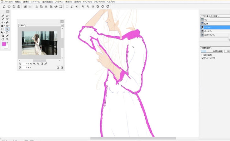 藤:「資料」ウインドウの「スポイト」ツールで、ワンピースの色を拾うことができますよ。それから、作業の途中にファイルを保存するのも忘れないでくださいね。