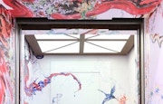 同じく「エレベーター部門」で入賞した安藤充がテーマとするのは「ネイチャーアルゴリズム」。古代中国の絵師、あるいはそこから影響を受けた琳派が描いてきた山水画を根底に置いている。先人たちの、自然の持つリズムを筆の流れやタッチ、顔料の滲みなどで表現する考えを発展させてきた安藤。「水が流れる」「木が育つ」といったドラマティックな変化の流れをリズミカルに捉え、アクリル絵具と油絵具によって、独特の色彩で描いている。110×80センチメートルの作品を4つ組み合わせて拡大させ、エレベーターを彩った今回は、ルミネという場所柄、「人」も要素として意識したという。