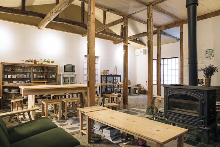 夜中まで女子トークで盛り上がったにもかかわらず、翌朝早起きして朝ごはんをつくる3人。2日目は晴れ間も見えて、半屋外のテラスでモーニング。林さんご夫妻は、近々この場所でカフェをオープンさせたい、と話す。「ochicochi village」とは「あちらこちら」や「現在・未来」という意味の古語「をちこち」が由来だそう。「それらの思いを込めて、古い廃材を利用して自らリノベーションしたり、キッチンには民芸の器を用意したりしています。海外からのゲストが多く、ときにはアーティストが1週間ほど滞在して静かな自然環境で創作活動を行うこともあります。そういったゲストとの交流の影響もあり、最近はリノベーション活動がさらに楽しくなりました。」と林さん。