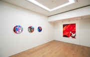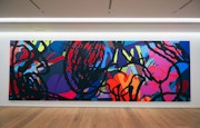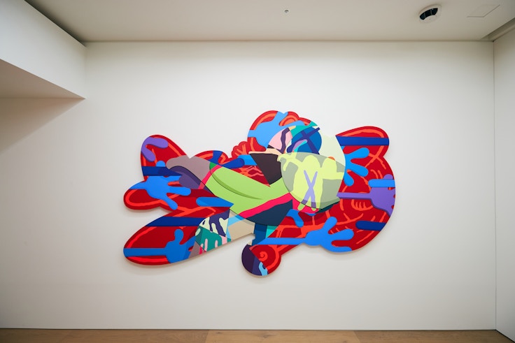 グラフィティアーティスト、トイデザイナー、彫刻家と様々な肩書きで語られるが、いまペロタン東京で紹介されているのは、画家としてのKAWSだ。原色の流線が飛び交うハードエッジ・ペインティングには、ポップカルチャーのキャラクターが節々に垣間見られる。