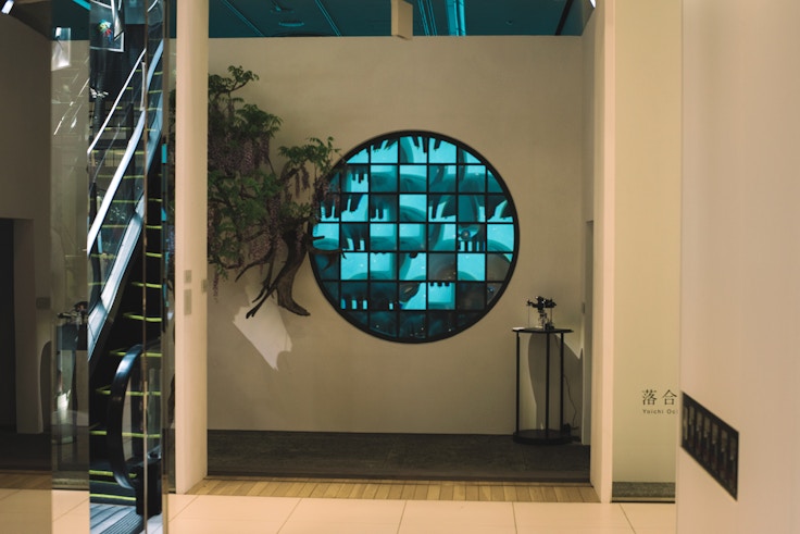 ——今回の個展では、タイトルに「山紫水明」「事事無碍」(一切の事象が互いに作用し合あうこと)といった言葉もあります。会場入り口には丸窓や、落合さん流の「生け花」があったりと、日本の古典的な美や美意識を想起させるものが多いですね。