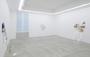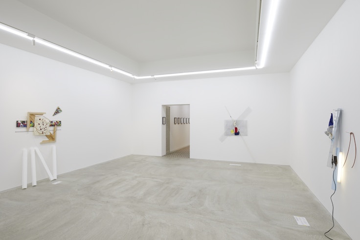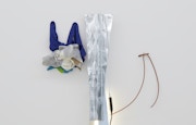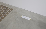 例えば、空間内での作品のレイアウトに驚きがあることが多いタトルさんですから、今回はどんな作品配置になるのだろうかと思って会場に来たのですが、逆にかなりオーソドックスに作品が並んでいたのでびっくりしました。しかし、壁面に展示されているそれぞれの立体の前、床の上に、紙にプリントされた日本語の言葉がメンディング・テープで留められています。これはタイトルなのだろうか。それともこの言葉も含めての作品なのだろうか、と迷います。それに、壁面の立体も、それぞれの要素が素材も形もバラバラで並列していて、にもかかわらず、なんとかばらけないバランスを保っている。床の文字も、そういう事態をもう一回り大きくしたような事態をつくっている要素のようにも感じられます。