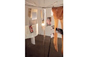 展覧会の体験は、これらの布に挟まれた空間を通り抜けることから始まる。そこには、人ひとりが歩けるくらいの狭いスペースが穿たれており、両肩に擦れたり離れたりする布の感触が伝わってくる。筆者がそこを訪れた際にはライタス本人が出迎え、この「通路」の先で自作について語ってくれた。