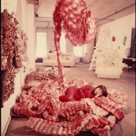 Peter Moore, Photo of Yayoi Kusama with "My Flower Bed" in her NYC studio, c.1965 (C) 2018 Barbara Moore / Licensed by VAGA at Artists Rights Society (ARS), NY, Courtesy Paula Cooper Gallery, New York.