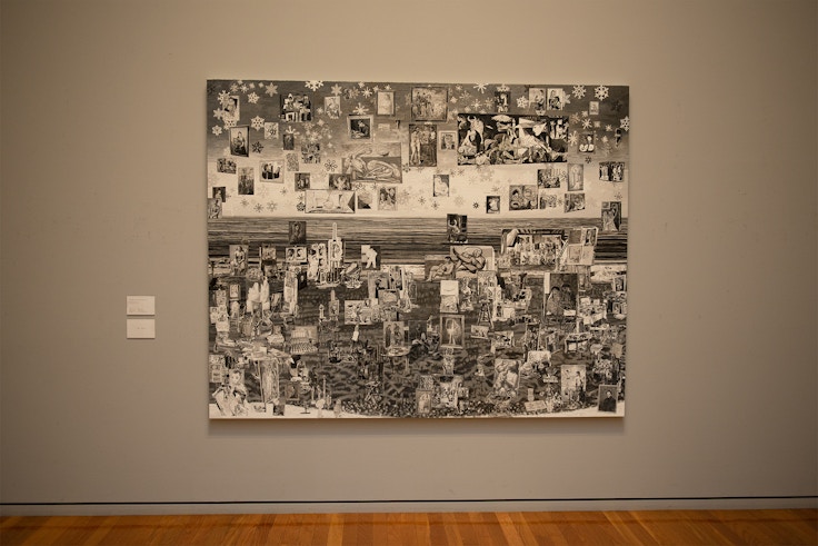 個展会場に入ると、1月のカレンダーを彩るのはパブロ・ピカソだ。《パブロ・ピカソのスタジオ》(2017)と題する白黒の作品に描かれた《ゲルニカ》や《泣く女》。遠くには海、数々のピカソ作品とアトリエの様子が組み込まれていて、画家の人生の縮図を1枚の画面に表現する試みを読み取ることができる。桑久保は次のように語る。