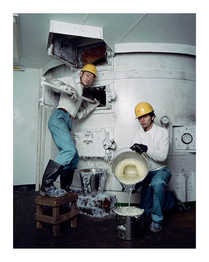 日本を旅していたときもそのことが頭にあり、捕鯨産業について調べながら捕鯨船員たちが直面している物質的な問題に興味を持つにつれ、その二つを合わせて考えるようになりました。解体用の甲板に乗るクジラの体は、一旦皮を剥いでしまうと、大きな重量を持った塊──脂肪に向き合わなければなりません。そのため、クジラの体を海上で処理する工船には、処理に必要なすべての機器が甲板に設置されています。これが『拘束のドローイング9』の最初の条件となりました──海上に浮かぶ船の解体用甲板で巨大なワセリンを鋳造して、船上の捕鯨機器を使ってその物質を処理するのです。