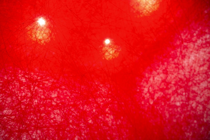 8.4kmの糸を使って、10日間ぐらいかけて6人で作業をしました。糸を編み続けて、ライトなどを調整して、赤い糸が見えなくなったときに作品が完成するイメージです。目で赤い糸を追っていたら、糸が消えて、目で追っていた世界ではない世界が見えてくるときに作品が完成するんです。糸が心地よい赤のモヤになるというか。